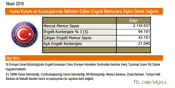 Devlet personel Başkanlığının açıkladığı verilere göre Nisan 2016 dönemi itibariyle Kamu Kurum ve Kuruluşlarında İstihdam Edilen Engelli Memurlara İlişkin Genel Dağılımı aşağıdaki şekildedir.
