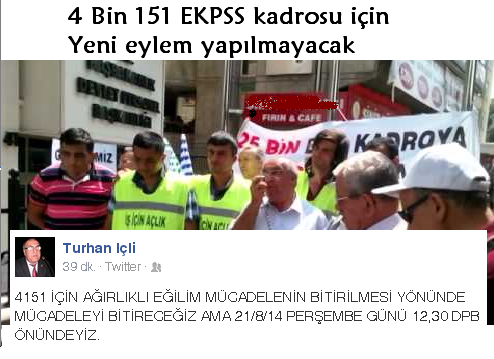 EKPSS kadrolarının arttırılması yönünde Açlık grevi yapan eylemciler adına konuşan Turhan İçli, 4 Bin 151 kişilik kadronun arttırılması yönünde ikinci bir eylem yapılmayacağını sadece basın toplantısı yapılacağını açıkladı.