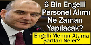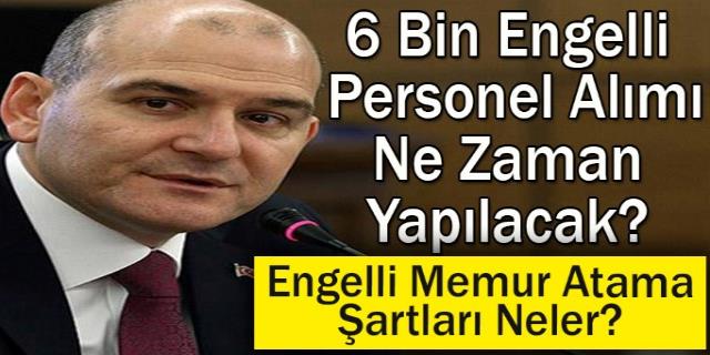 Engelli personel alımı için geçtiğimiz günlerde açıklamalarda bulunan için Çalışma ve Sosyal Güvenlik Bakanı Süleyman Soylu, “Temmuz sonu itibarıyla Allah nasip ederse 6 bin engelli vatandaşımızı kamu istihdamıyla beraber buluşturacağız.” dedi. Bakan Soylu, Türkiye İş Kurumunun (İŞKUR) hibe desteğinden yararlanılarak, engellilere yönelik yürütülen faaliyet kapsamında Serdivan ilçesinde yapılan simit fırınının açılış törenine katıldı. İŞKUR’un geçmiş yıllardaki durumunu, sürecini, vatandaşın gittiği zaman hangi ilgiyle karşılandığını, bugün de meseleler karşısında nasıl çözüm ürettiğini hep birlikte takip ettiklerini belirtti.