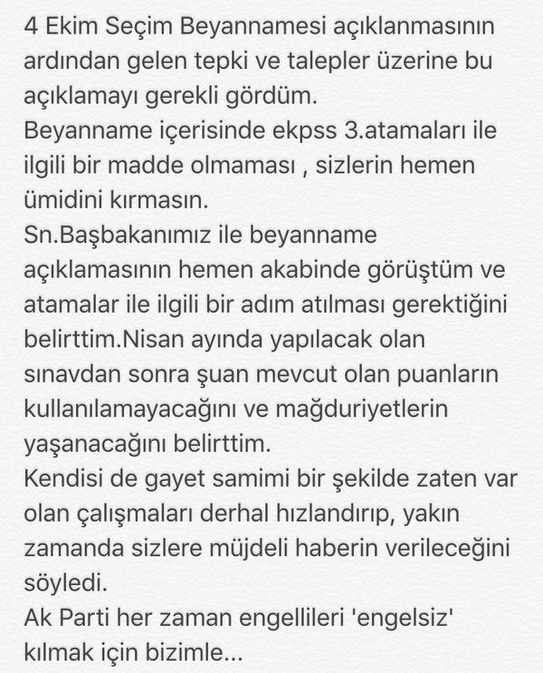 Engelli milletvekili Bennur Karaburun 2014 puanıyla yeni bir EKPSS atamasının 2016 EKPSS den önce yapılması gerektiğine dair Başbakana engellilerin isteğini iletti. Bakalım seçime doğru yeni bir ekpss ataması olurmu hep birlikte göreceğiz.