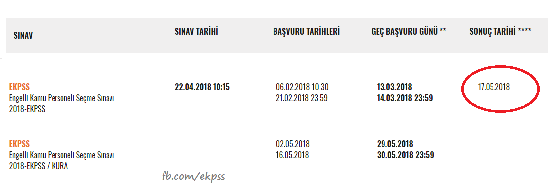 ÖSYM sitesi sınav takvimine baktığımızda aşağıda görüleceği üzere EKPSS sınav sonuç açıklanma tarihinin 17 Mayıs 2018 olarak görmekteyiz.