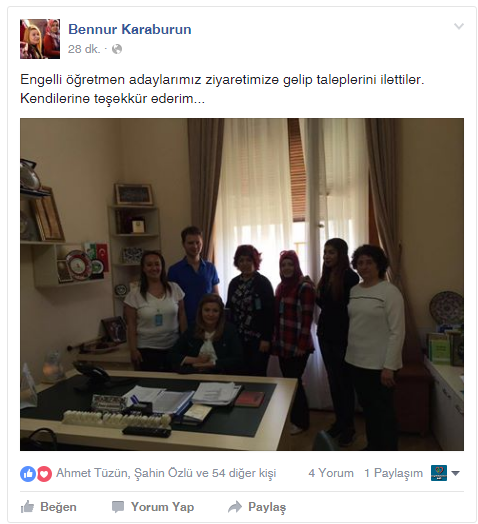 Ankara’da engelli öğretmen adaylarını kabul eden Karaburun bu durumu sosyal medya hesabından yapmış olduğu açıklamalar ile tüm engelli vatandaşlarımıza duyurdu. Açıklamalarda engelli öğretmen adaylarının kendisini ziyarete geldiğini ifade eden Karaburun bu ziyarette taleplerin iletildiğini belirterek engelli öğretmen adaylarına teşekkür etti.