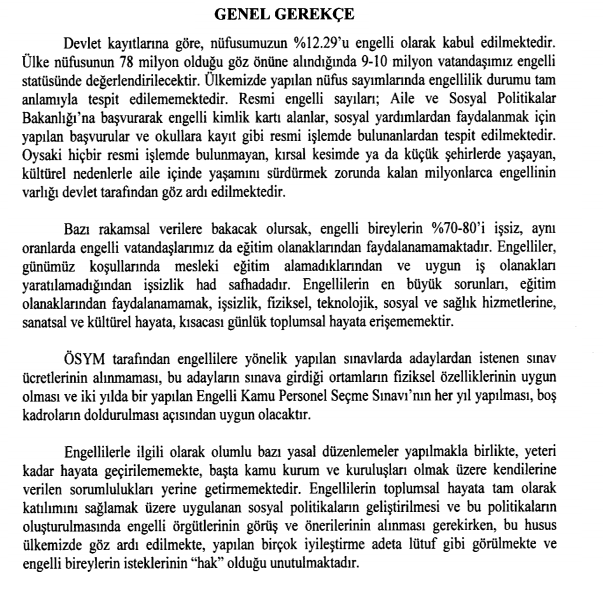 Kanun teklifinde engellilerden alınan harçların kapsamında ÖSYM tarafından engellilere yönelik yapılan sınavlarda adaylardan ücret alınmaması, bu adayların sınava girdiği ortamların uygun olması, EKPSS’nin her yıl yapılmasının boş kadroların doldurulması açısından uygun olacaktır görüşüne yer verildi.