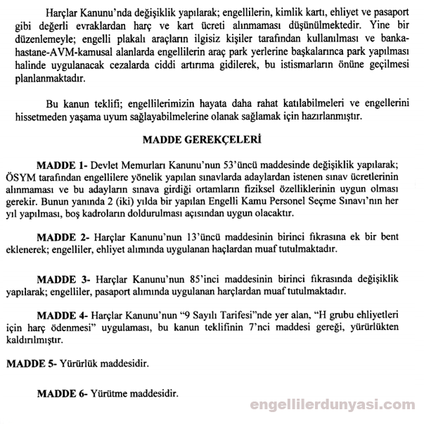 Harçlar kanununda değişiklik yapılarak engellilerin kimlik kartı, ehliyet, ve pasaport gibi değerli evraklardan harç ve kart ücretinin alınmaması görüşü kanun teklifinde yer aldı.