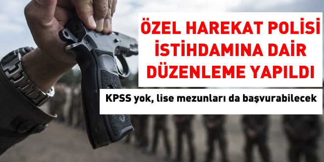 “Özel harekat birimlerinde istihdam edilmek üzere, yirmisekiz yaşından gün almamış olmak ve terhis tarihinden itibaren otuzaltı aydan fazla süre geçmemiş olmak kaydıyla, en az lise veya dengi okul mezunlarından askerlik hizmetini tamamlamış olanlar, Kamu Personel Seçme Sınavı şartı aranmaksızın, fiziki yeterlilik ve mülakat sınavları ile polis meslek eğitim merkezlerine alınabilir.”
