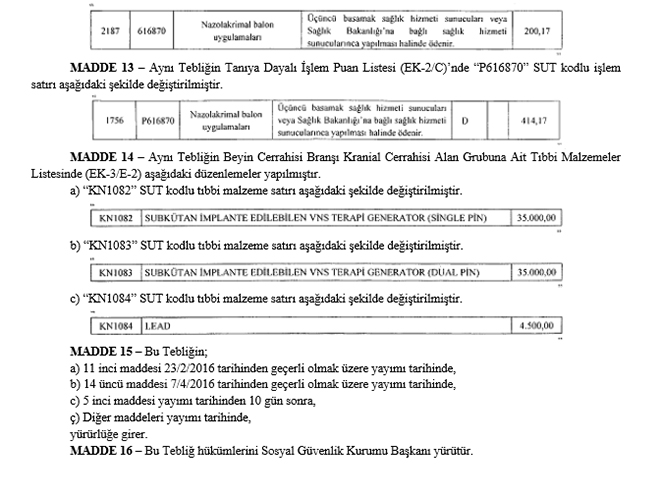 Sağlık Uygulama Tebliğinde (SUT) değişiklik yapıldı. Sosyal Güvenlik Kurumu Sağlık Uygulama Tebliğinde Değişiklik Yapılmasına Dair Tebliğ.